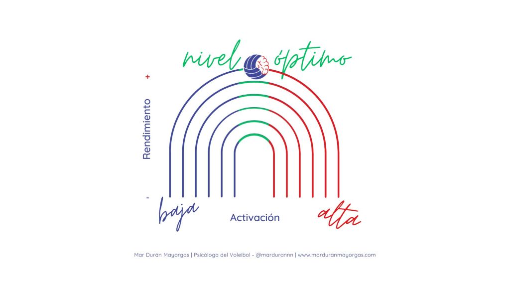 Es decir, si estoy muy cansado, medio dormido o muy relajado (baja activación) mi rendimiento no estará en el punto que me permita sacar el mayor partido a mis habilidades como deportista. De igual forma, si la situación es muy estresante, mi ansiedad supera los estándares y no se gestionarla adecuadamente (máxima activación), acabaré debilitando mi rendimiento y no podré prestar atención a mi juego.