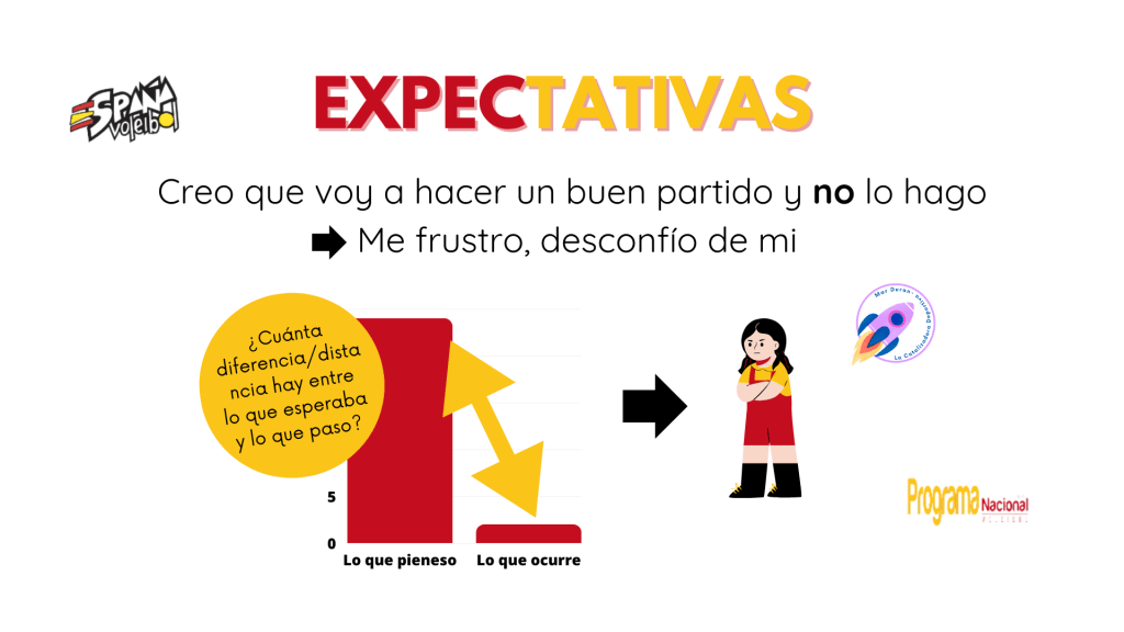 Las expectativas van a influir directamente en tu autoconfianza y éxito. Es decir, si piensas que vas a ganar el partido 3-0 (expectativa) y el resultado (logro) es 0-3 tu autoconfianza bajará ya que la diferencia entre lo que esperabas y sucedió fue muy grande.