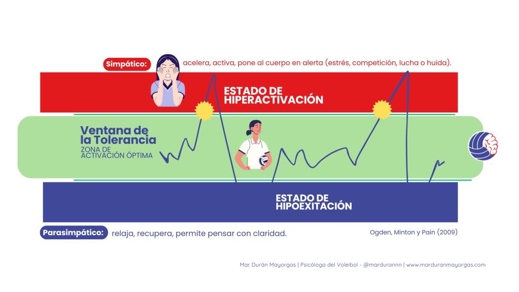 Cuando estamos fuera de nuestra ventana de tolerancia, nuestras emociones nos desbordan. Esto puede darse por múltiples factores, como desconfianza en mi ataque, inseguridad en mi saque o la creencia de que si fallo, iré al banquillo.